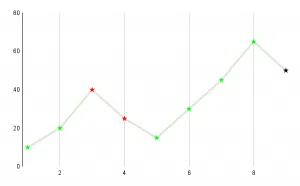 In the graph above, the Y axis represents the level of difficulty. Every red dot that you can see is a wrong answer (because of this level of difficulty has fallen) and every green dot represents a rights answer (which will lead to an increase in the level of difficulty).